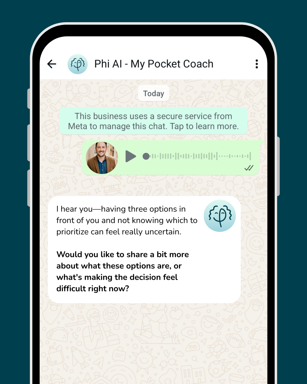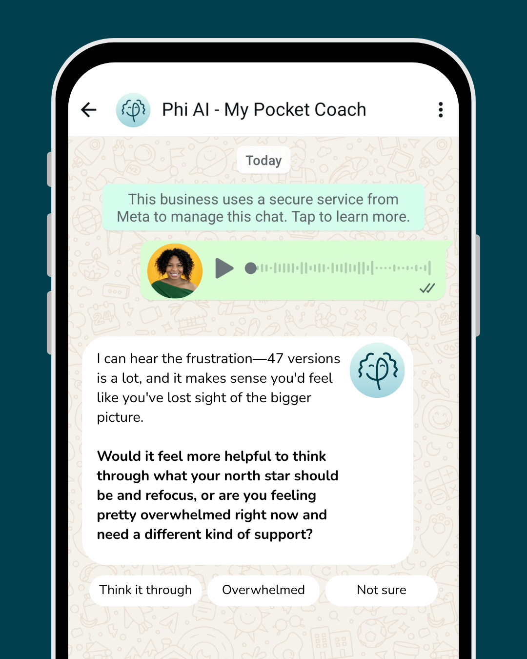 When you're overwhelmed, stuck in decision fatigue, or your mind won't stop spinning, Phi helps you talk through it so you can move forward with clarity.